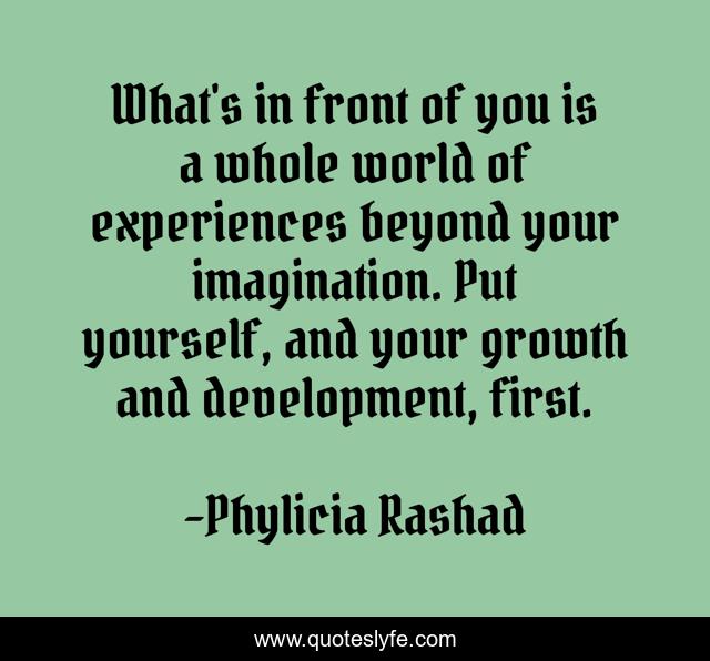 This page presents the quote "What's in front of you is a whole world of experiences beyond your imagination. Put yourself, and your growth and development, first.". Author of this quote is Phylicia Rashad. This quote is about world, growth, yourself,.