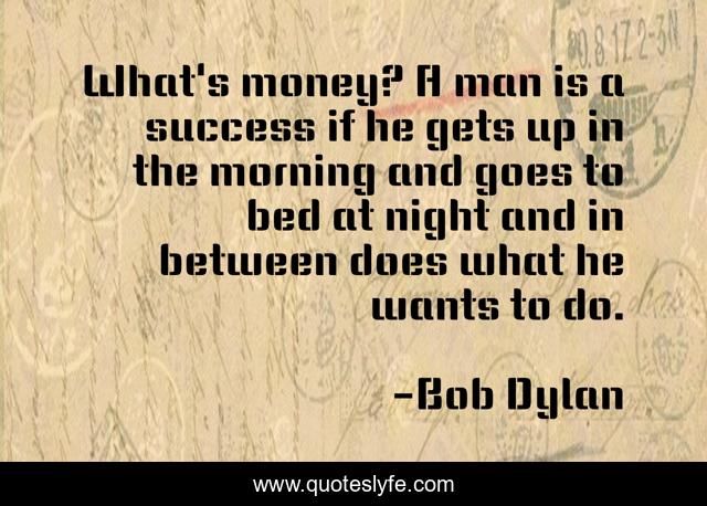 This page presents the quote "What's money? A man is a success if he gets up in the morning and goes to bed at night and in between does what he wants to do.". Author of this quote is Bob Dylan. This quote is about money, success, man,.