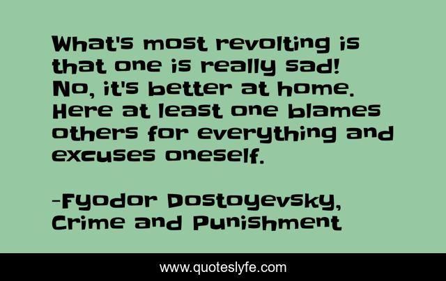 This page presents the quote "What's most revolting is that one is really sad! No, it's better at home. Here at least one blames others for everything and excuses oneself.". Author of this quote is Fyodor Dostoyevsky, Crime and Punishment. This quote is about home, foreign-travel, svidrigailov,.