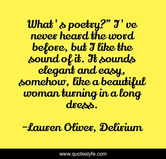This page presents the quote "What's poetry?" I've never heard the word before, but I like the sound of it. It sounds elegant and easy, somehow, like a beautiful woman turning in a long dress.". Author of this quote is Lauren Oliver, Delirium. This quote is about delirium, young-adult, affection, love,.