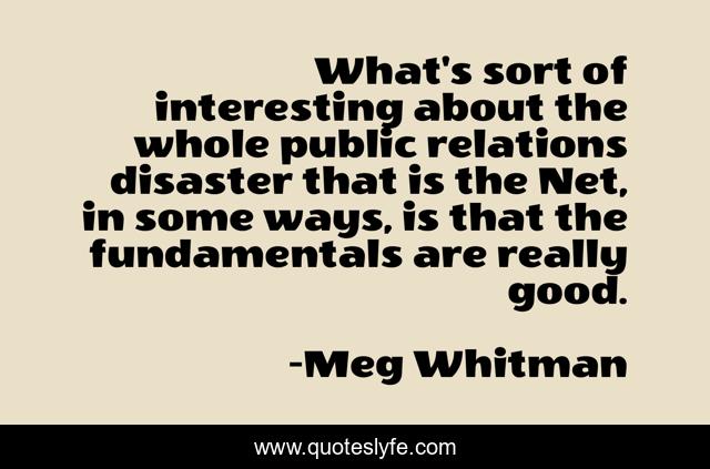 This page presents the quote "What's sort of interesting about the whole public relations disaster that is the Net, in some ways, is that the fundamentals are really good.". Author of this quote is Meg Whitman. This quote is about interesting, good, disaster,.