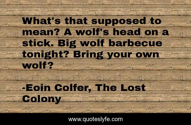 This page presents the quote "What's that supposed to mean? A wolf's head on a stick. Big wolf barbecue tonight? Bring your own wolf?". Author of this quote is Eoin Colfer, The Lost Colony. This quote is about humor, wolf, signs, barbecue, wolves, bbq,.