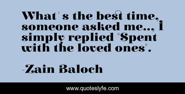 This page presents the quote "What's the best time, someone asked me.., I simply replied "Spent with the loved ones".". Author of this quote is Zain Baloch. This quote is about loved-ones, love, spent, affection, time,.