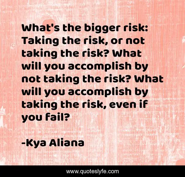 This page presents the quote "What's the bigger risk: Taking the risk, or not taking the risk? What will you accomplish by not taking the risk? What will you accomplish by taking the risk, even if you fail?". Author of this quote is Kya Aliana. This quote is about life, love, quote, motivational, confidence, kya-aliana, positive, quotes-for-men, optimistic,.