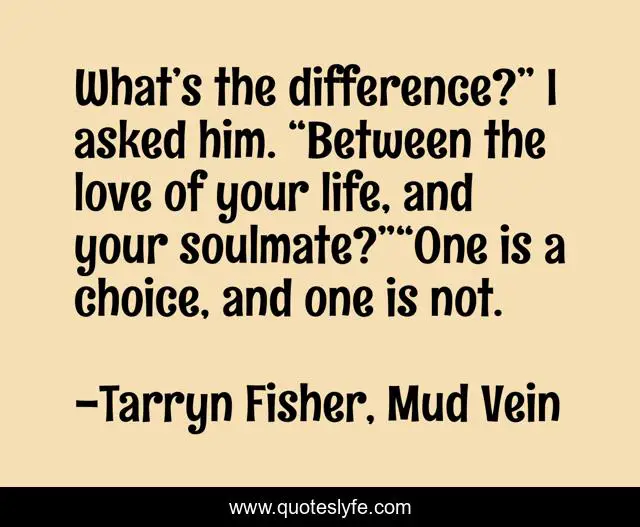 This page presents the quote "What’s the difference?” I asked him. “Between the love of your life, and your soulmate?”“One is a choice, and one is not.". Author of this quote is Tarryn Fisher, Mud Vein. This quote is about love-of-your-life, soulmates,.