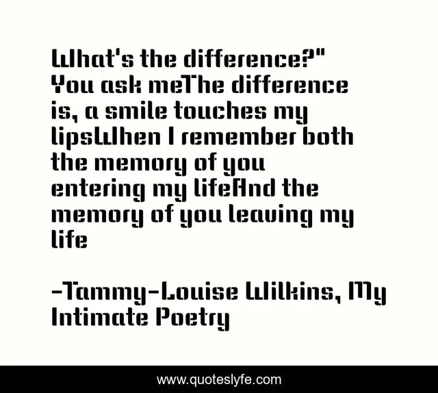 This page presents the quote "What's the difference?" You ask meThe difference is, a smile touches my lipsWhen I remember both the memory of you entering my lifeAnd the memory of you leaving my life". Author of this quote is Tammy-Louise Wilkins, My Intimate Poetry. This quote is about relationships, loss, love, letting-go, a-non-cliché-new-beginning, heartbreak, moving-on, affection, happy,.