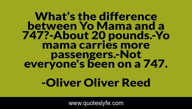 This page presents the quote "What’s the difference between Yo Mama and a 747?-About 20 pounds.-Yo mama carries more passengers.-Not everyone's been on a 747.". Author of this quote is Oliver Oliver Reed. This quote is about yo-mama, humour, humorous, yo-mama-dirty-jokes, worlds-funniest-jokes, funny-jokes, funny, funny-and-random, funny-joke,.