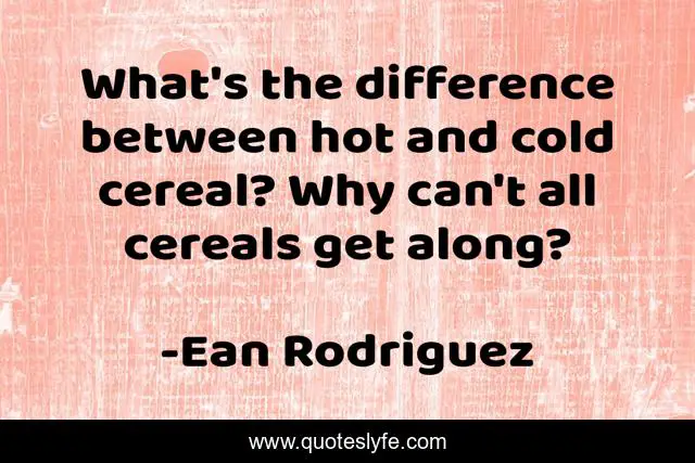 This page presents the quote "What's the difference between hot and cold cereal? Why can't all cereals get along?". Author of this quote is Ean Rodriguez. This quote is about love, inspirational, convincing, questions, enthusiasm, affection,.