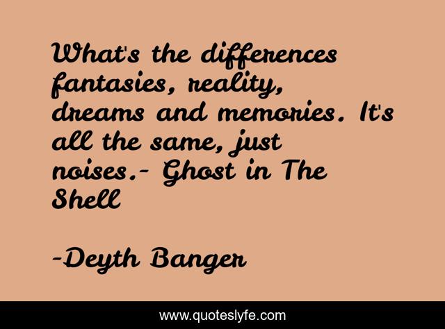 This page presents the quote "What's the differences fantasies, reality, dreams and memories. It's all the same, just noises.- Ghost in The Shell". Author of this quote is Deyth Banger. This quote is about memories, dreams, film, reality,.