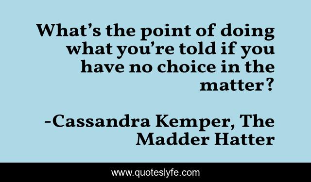 This page presents the quote "What’s the point of doing what you’re told if you have no choice in the matter?". Author of this quote is Cassandra Kemper, The Madder Hatter. This quote is about freedom, hatter, choice,.