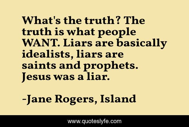 This page presents the quote "What's the truth? The truth is what people WANT. Liars are basically idealists, liars are saints and prophets. Jesus was a liar.". Author of this quote is Jane Rogers, Island. This quote is about religion, logical-thinking, truth, jesus,.