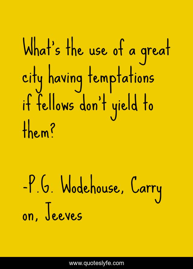 This page presents the quote "What's the use of a great city having temptations if fellows don't yield to them?". Author of this quote is P.G. Wodehouse, Carry on, Jeeves. This quote is about new-york-city, humor, temptation,.