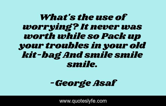 This page presents the quote "What's the use of worrying? It never was worth while so Pack up your troubles in your old kit-bag And smile smile smile.". Author of this quote is George Asaf. This quote is about smile, happiness,.