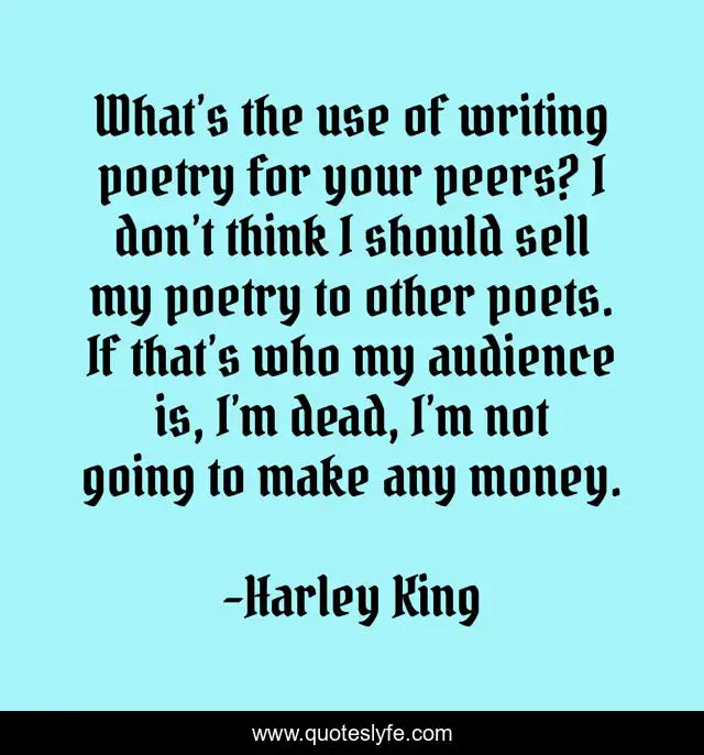 This page presents the quote "What’s the use of writing poetry for your peers? I don’t think I should sell my poetry to other poets. If that’s who my audience is, I’m dead, I’m not going to make any money.". Author of this quote is Harley King. This quote is about money, poets, writing, audience, poetry,.