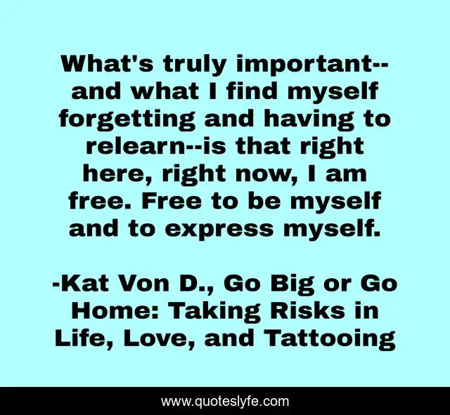 This page presents the quote "What's truly important--and what I find myself forgetting and having to relearn--is that right here, right now, I am free. Free to be myself and to express myself.". Author of this quote is Kat Von D., Go Big or Go Home: Taking Risks in Life, Love, and Tattooing. This quote is about freedom, individuality, free, inspirational, enthusiasm,.