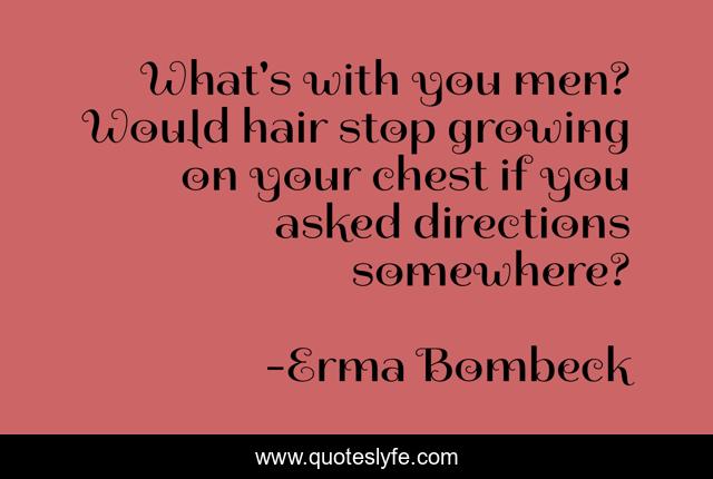 This page presents the quote "What's with you men? Would hair stop growing on your chest if you asked directions somewhere?". Author of this quote is Erma Bombeck. This quote is about men, women,.