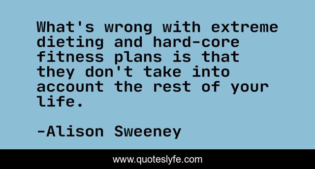 This page presents the quote "What's wrong with extreme dieting and hard-core fitness plans is that they don't take into account the rest of your life.". Author of this quote is Alison Sweeney. This quote is about life, plans, rest,.