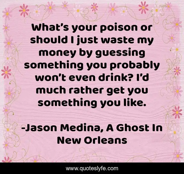 This page presents the quote "What’s your poison or should I just waste my money by guessing something you probably won’t even drink? I’d much rather get you something you like.". Author of this quote is Jason Medina, A Ghost In New Orleans. This quote is about something-you-like, guessing, guess, drink, tribal-publications-inc, alcohol, pick-up-lines, a-ghost-in-new-orleans, guessing-something,.