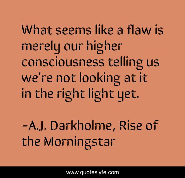 This page presents the quote "What seems like a flaw is merely our higher consciousness telling us we're not looking at it in the right light yet.". Author of this quote is A.J. Darkholme, Rise of the Morningstar. This quote is about flaws, consciousness, improvement, improvements, perspective, self-awareness, self-doubt, self-improvement,.