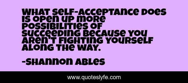 This page presents the quote "What self-acceptance does is open up more possibilities of succeeding because you aren't fighting yourself along the way.". Author of this quote is Shannon Ables. This quote is about self-acceptance, self-esteem,.