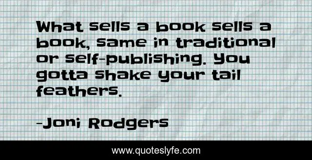 This page presents the quote "What sells a book sells a book, same in traditional or self-publishing. You gotta shake your tail feathers.". Author of this quote is Joni Rodgers. This quote is about marketing, inspirational, enthusiasm,.