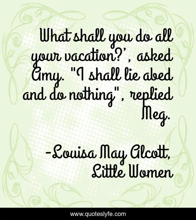 This page presents the quote "What shall you do all your vacation?’, asked Amy. "I shall lie abed and do nothing", replied Meg.". Author of this quote is Louisa May Alcott, Little Women. This quote is about sleep, vacation,.