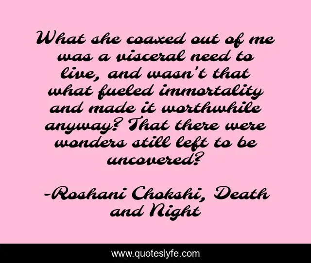 This page presents the quote "What she coaxed out of me was a visceral need to live, and wasn't that what fueled immortality and made it worthwhile anyway? That there were wonders still left to be uncovered?". Author of this quote is Roshani Chokshi, Death and Night. .