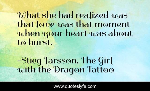 This page presents the quote "What she had realized was that love was that moment when your heart was about to burst.". Author of this quote is Stieg Larsson, The Girl with the Dragon Tattoo. This quote is about adoration, love, infatuation, affection,.