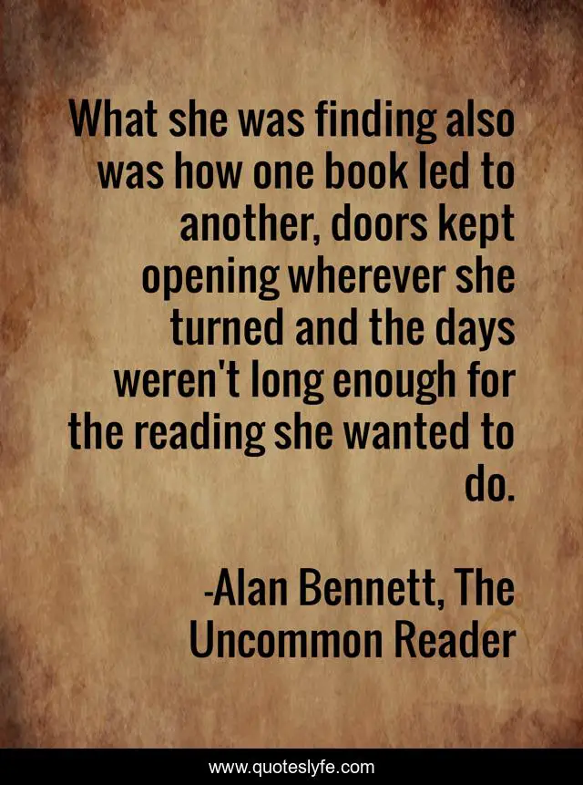 This page presents the quote "What she was finding also was how one book led to another, doors kept opening wherever she turned and the days weren't long enough for the reading she wanted to do.". Author of this quote is Alan Bennett, The Uncommon Reader. .