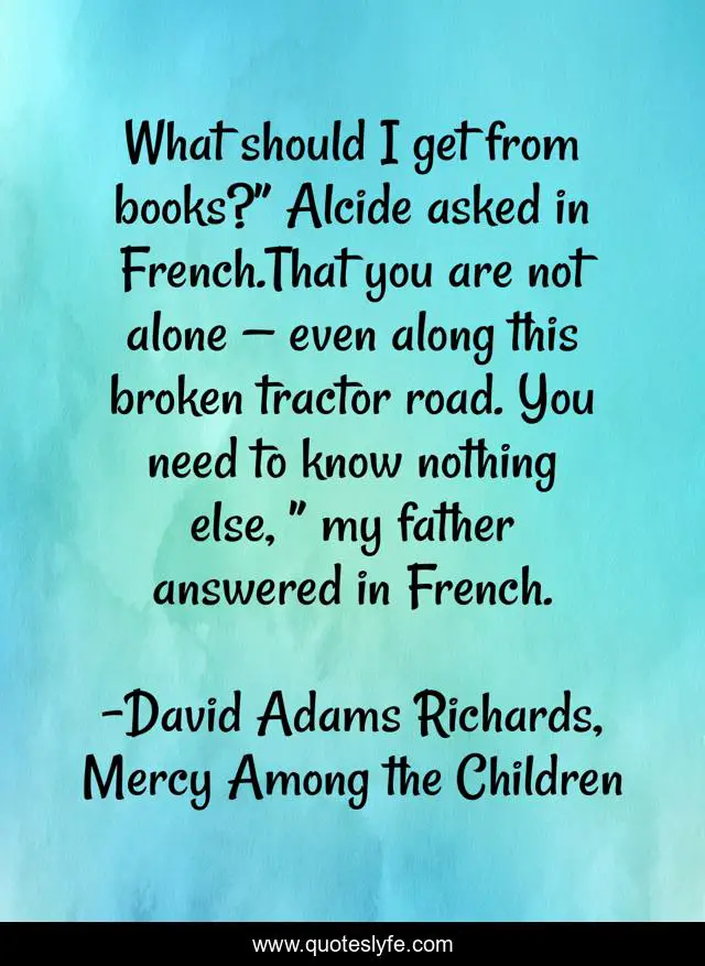 This page presents the quote "What should I get from books?” Alcide asked in French.That you are not alone — even along this broken tractor road. You need to know nothing else, ” my father answered in French.". Author of this quote is David Adams Richards, Mercy Among the Children. .