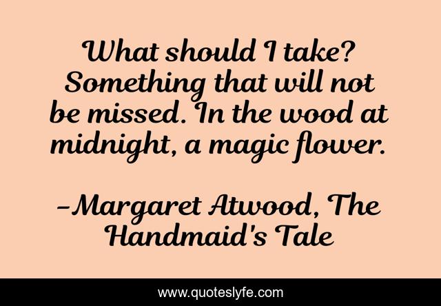 This page presents the quote "What should I take? Something that will not be missed. In the wood at midnight, a magic flower.". Author of this quote is Margaret Atwood, The Handmaid's Tale. This quote is about meaning, flower, precious, theft,.