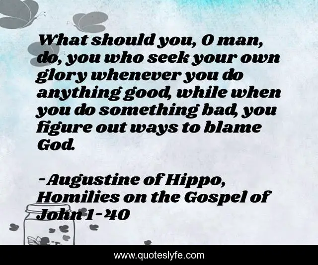 This page presents the quote "What should you, O man, do, you who seek your own glory whenever you do anything good, while when you do something bad, you figure out ways to blame God.". Author of this quote is Augustine of Hippo, Homilies on the Gospel of John 1-40. This quote is about spiritual-wisdom, humility,.