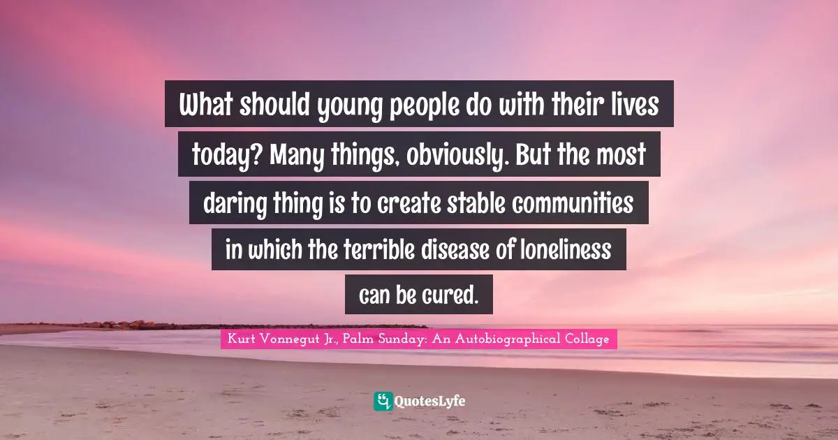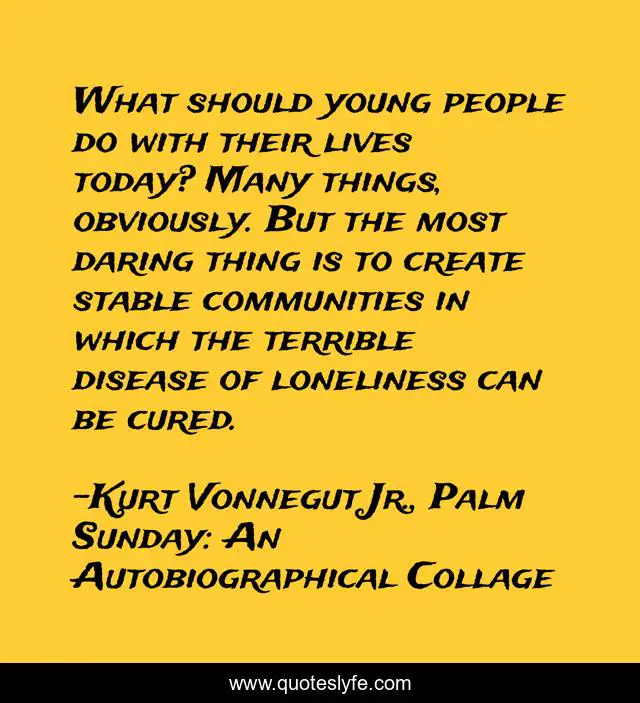 This page presents the quote "What should young people do with their lives today? Many things, obviously. But the most daring thing is to create stable communities in which the terrible disease of loneliness can be cured.". Author of this quote is Kurt Vonnegut Jr., Palm Sunday: An Autobiographical Collage. This quote is about daring, loneliness, community, youth, purpose, action,.