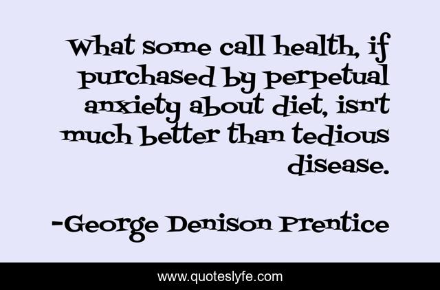 This page presents the quote "What some call health, if purchased by perpetual anxiety about diet, isn't much better than tedious disease.". Author of this quote is George Denison Prentice. This quote is about anxiety, health, disease, diet,.