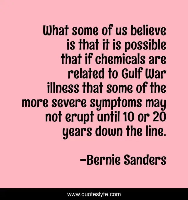 This page presents the quote "What some of us believe is that it is possible that if chemicals are related to Gulf War illness that some of the more severe symptoms may not erupt until 10 or 20 years down the line.". Author of this quote is Bernie Sanders. This quote is about down, believe, years,.