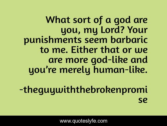 This page presents the quote "What sort of a god are you, my Lord? Your punishments seem barbaric to me. Either that or we are more god-like and you’re merely human-like.". Author of this quote is theguywiththebrokenpromise. This quote is about atheist, atheism, religion, barbaric, god, punishment,.