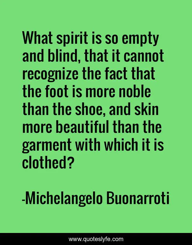 This page presents the quote "What spirit is so empty and blind, that it cannot recognize the fact that the foot is more noble than the shoe, and skin more beautiful than the garment with which it is clothed?". Author of this quote is Michelangelo Buonarroti. This quote is about foot, spiritual, spirit, skin,.