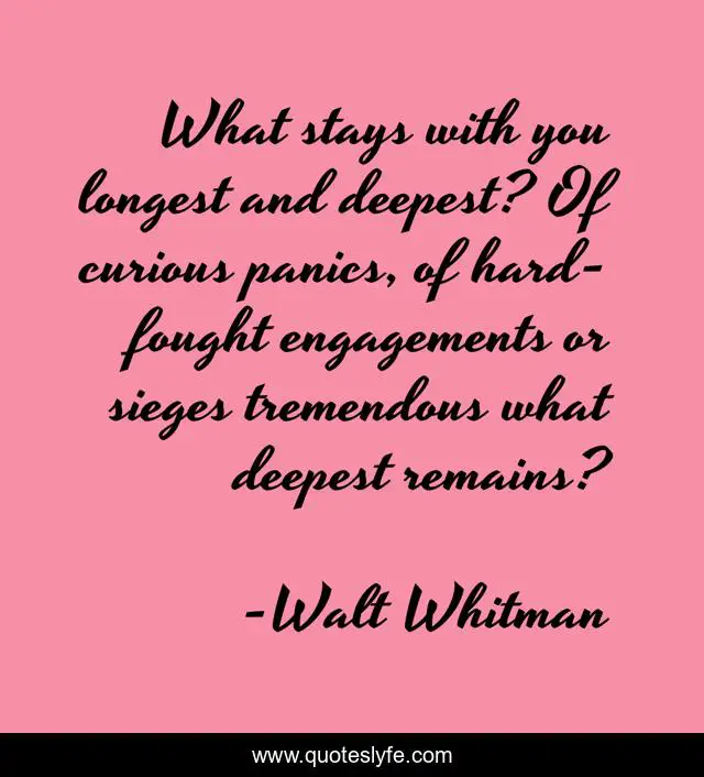 This page presents the quote "What stays with you longest and deepest? Of curious panics, of hard-fought engagements or sieges tremendous what deepest remains?". Author of this quote is Walt Whitman. This quote is about life, inspirational, learning, depth, truth, impressions, enthusiasm, what-matters,.