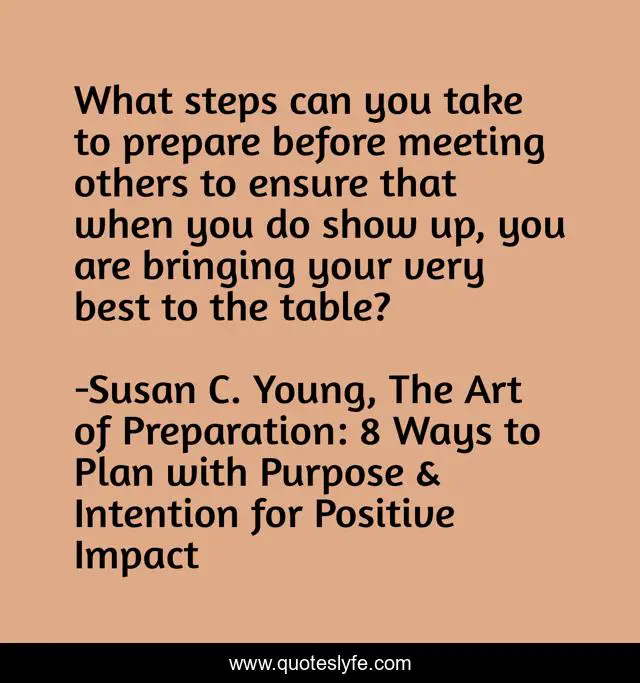 This page presents the quote "What steps can you take to prepare before meeting others to ensure that when you do show up, you are bringing your very best to the table?". Author of this quote is Susan C. Young, The Art of Preparation: 8 Ways to Plan with Purpose & Intention for Positive Impact. This quote is about relationship, susan-young, communication-skills, preparation, quotes-by-susan-c-young, motivational-speaker,.
