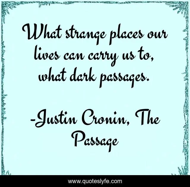 This page presents the quote "What strange places our lives can carry us to, what dark passages.". Author of this quote is Justin Cronin, The Passage. This quote is about life, darkness,.