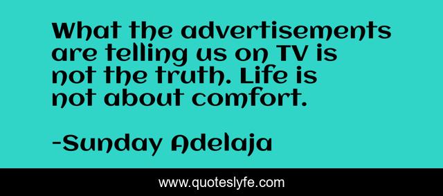 This page presents the quote "What the advertisements are telling us on TV is not the truth. Life is not about comfort.". Author of this quote is Sunday Adelaja. This quote is about comfort, advertisement, truth,.