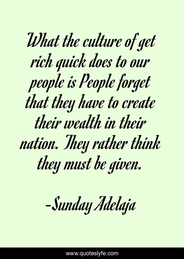 This page presents the quote "What the culture of get rich quick does to our people is People forget that they have to create their wealth in their nation. They rather think they must be given.". Author of this quote is Sunday Adelaja. This quote is about given, forget, people, rather, create, their, culture, they, our,.