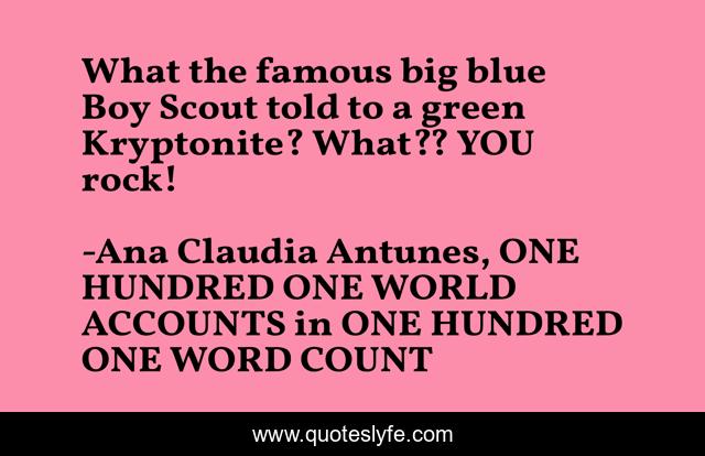 This page presents the quote "What the famous big blue Boy Scout told to a green Kryptonite? What?? YOU rock!". Author of this quote is Ana Claudia Antunes, ONE HUNDRED ONE WORLD ACCOUNTS in ONE HUNDRED ONE WORD COUNT. This quote is about tales-of-the-city, powerful, accounts, superheroes, superman, city, funny-and-random, tales, kryptonite,.