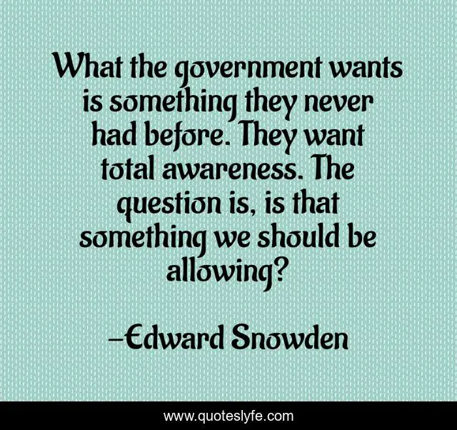 This page presents the quote "What the government wants is something they never had before. They want total awareness. The question is, is that something we should be allowing?". Author of this quote is Edward Snowden. This quote is about question, awareness,.