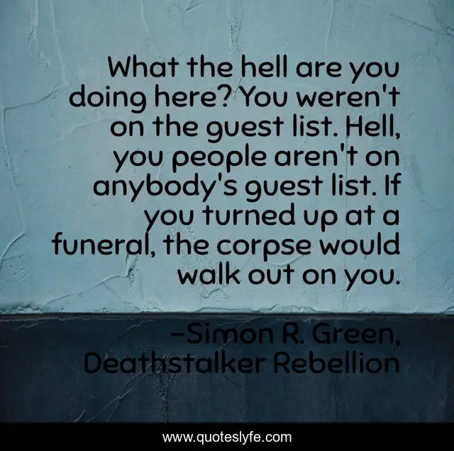 This page presents the quote "What the hell are you doing here? You weren't on the guest list. Hell, you people aren't on anybody's guest list. If you turned up at a funeral, the corpse would walk out on you.". Author of this quote is Simon R. Green, Deathstalker Rebellion. This quote is about humor, humour,.