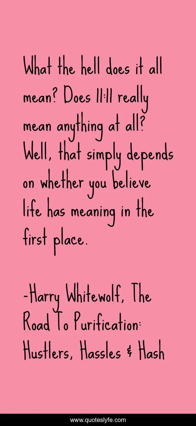"Harry Whitewolf, The Road To Purification: Hustlers, Hassles & Hash Quotes." Quoteslyfe.com, 2025. Fri. 05 Dec. 2025. <https://www.quoteslyfe.com/quote/What-the-hell-does-it-all-mean-254144>.