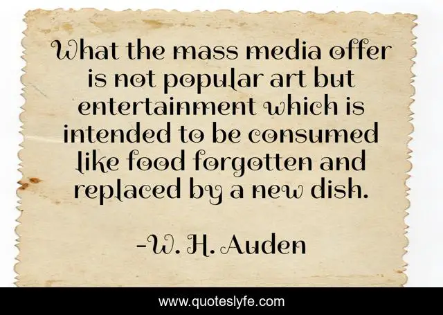 This page presents the quote "What the mass media offer is not popular art but entertainment which is intended to be consumed like food forgotten and replaced by a new dish.". Author of this quote is W. H. Auden. This quote is about enjoyment, pleasure,.