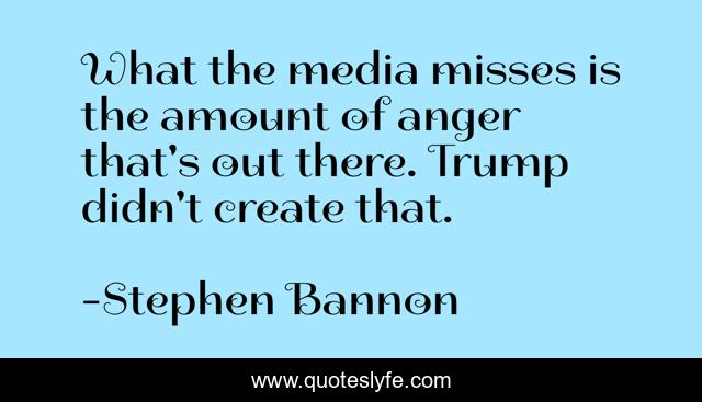 This page presents the quote "What the media misses is the amount of anger that's out there. Trump didn't create that.". Author of this quote is Stephen Bannon. This quote is about media, create, trump,.