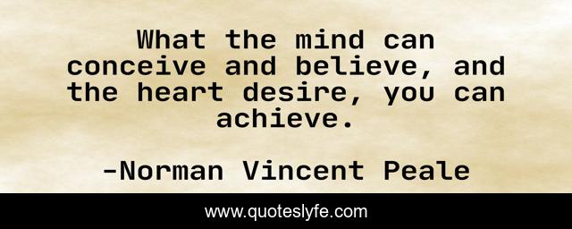 This page presents the quote "What the mind can conceive and believe, and the heart desire, you can achieve.". Author of this quote is Norman Vincent Peale. This quote is about confidence, self-confidence, belief, desires, positive, motivational, aims, goals, inspirational,.