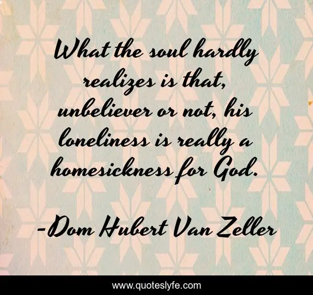 This page presents the quote "What the soul hardly realizes is that, unbeliever or not, his loneliness is really a homesickness for God.". Author of this quote is Dom Hubert Van Zeller. This quote is about god, soul, inspirational, enthusiasm,.